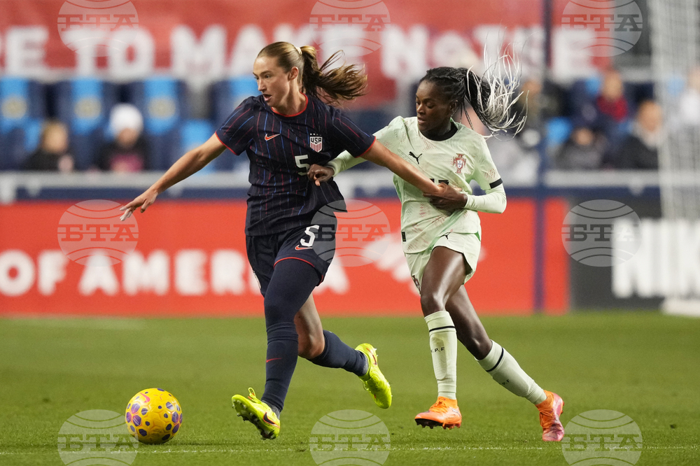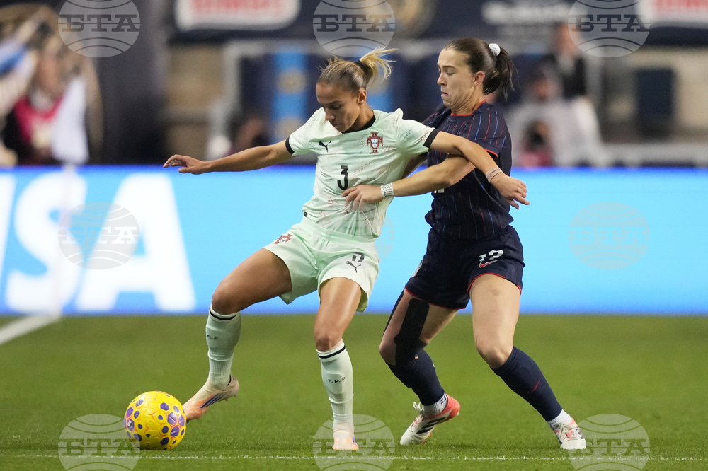 Portugal's Diana Silva, left, and United States' Emily Sonnett vie for the ball during the first half of an international friendly women's soccer match, Thursday, Oct. 23, 2025, in Chester, Pa. (AP Photo/Matt Slocum)