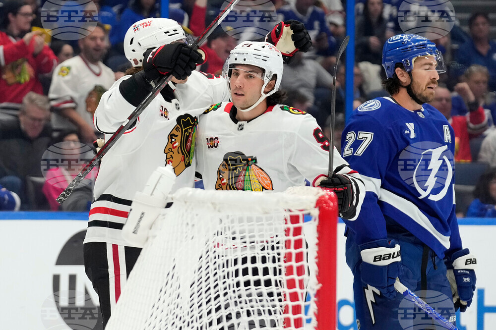 Chicago Blackhawks center Frank Nazar (91) celebrates his goal against the Tampa Bay Lightning with left wing Tyler Bertuzzi during the first period of an NHL hockey game Thursday, Oct. 23, 2025, in Tampa, Fla. (AP Photo/Chris O'Meara)