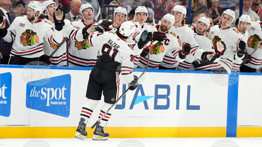 Chicago Blackhawks center Frank Nazar (91) celebrates with the bench after his goal against the Tampa Bay Lightning during the first period of an NHL hockey game Thursday, Oct. 23, 2025, in Tampa, Fla. (AP Photo/Chris O'Meara)