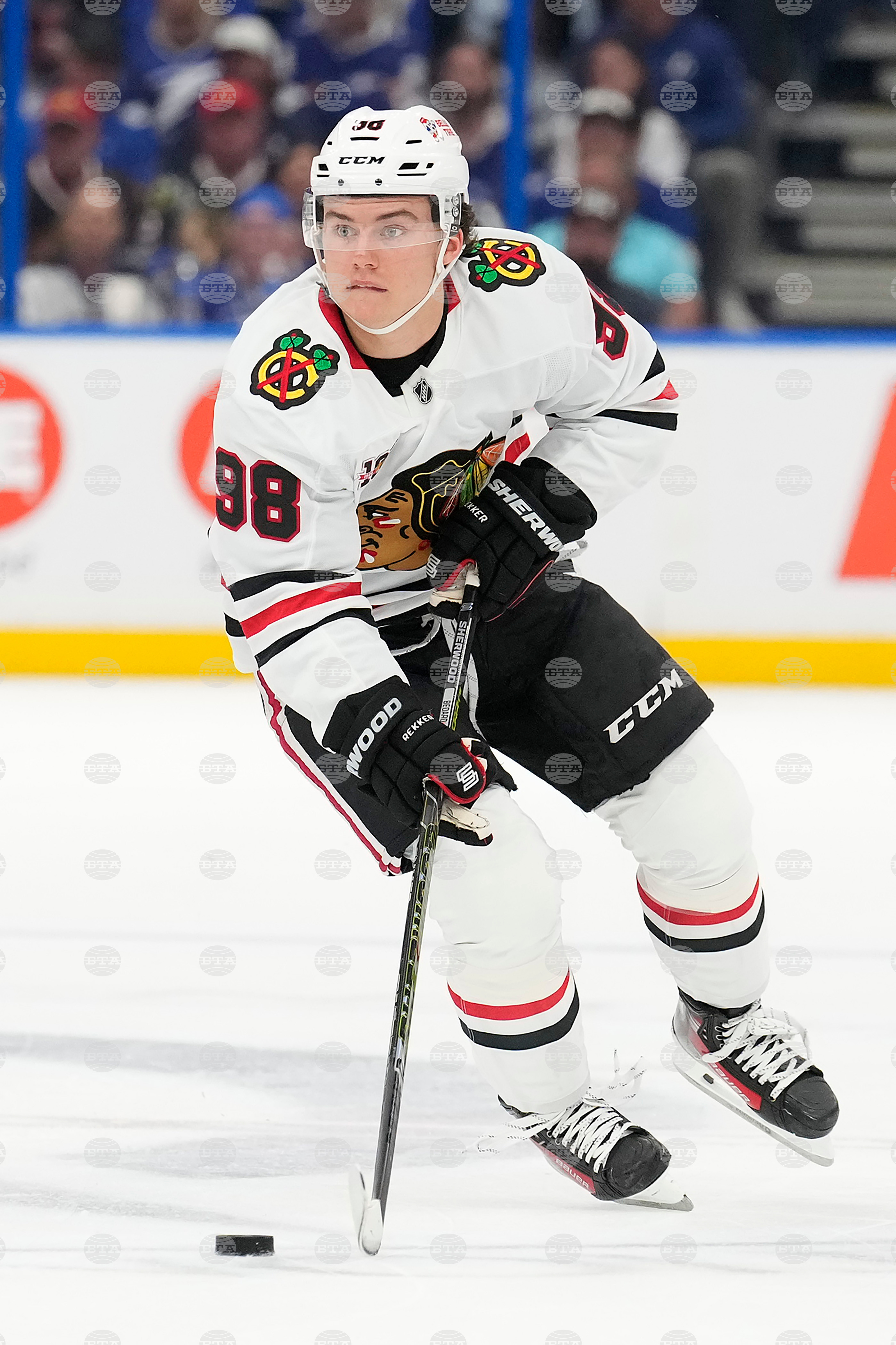 Chicago Blackhawks center Connor Bedard (98) moves the puck through the neutral zone against the Tampa Bay Lightning during the first period of an NHL hockey game Thursday, Oct. 23, 2025, in Tampa, Fla. (AP Photo/Chris O'Meara)