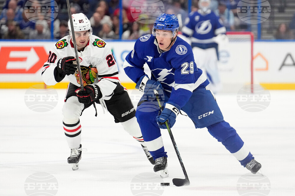 Tampa Bay Lightning right wing Pontus Holmberg (29) skates ahead of Chicago Blackhawks center Ryan Greene (20) during the second period of an NHL hockey game Thursday, Oct. 23, 2025, in Tampa, Fla. (AP Photo/Chris O'Meara)
