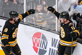 Boston Bruins center Casey Mittelstadt, right, celebrates after his first period goal during an NHL hockey game against the Anaheim Ducks, Thursday, Oct. 23, 2025, in Boston. (AP Photo/Charles Krupa)