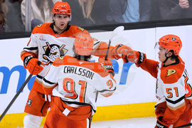 Anaheim Ducks center Mikael Granlund (64) is congratulated after his goal against the Boston Bruins during the third period of an NHL hockey game, Thursday, Oct. 23, 2025, in Boston. (AP Photo/Charles Krupa)
