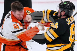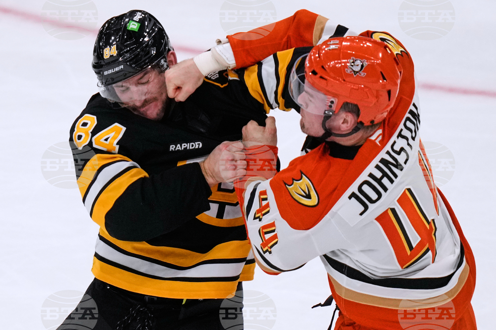 Boston Bruins left wing Tanner Jeannot (84) lands a punch in a fight against Anaheim Ducks left wing Ross Johnston (44) during the second period of an NHL hockey game, Thursday, Oct. 23, 2025, in Boston. (AP Photo/Charles Krupa)