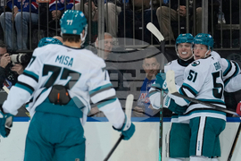 San Jose Sharks' Will Smith, left, celebrates his winning goal with Macklin Celebrini, center, and goaltender Alex Nedeljkovic (33) at the end of the overtime period of an NHL hockey game in New York, Thursday, Oct. 23, 2025. (AP Photo/Seth Wenig)