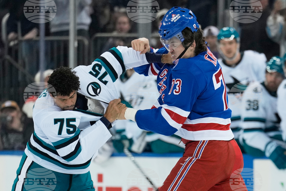New York Rangers' Matt Rempe, right, fights with San Jose Sharks' Ryan Reaves during the first period of an NHL hockey game in New York, Thursday, Oct. 23, 2025. (AP Photo/Seth Wenig)