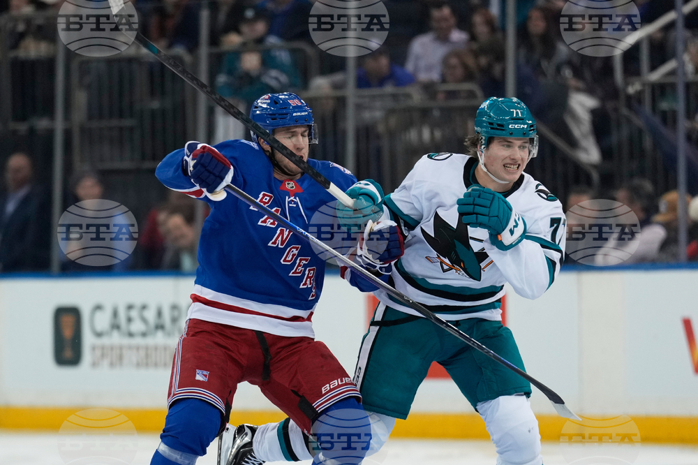 New York Rangers' Vladislav Gavrikov, left, and San Jose Sharks' Tyler Toffoli collide during the third period of an NHL hockey game in New York, Thursday, Oct. 23, 2025. (AP Photo/Seth Wenig)