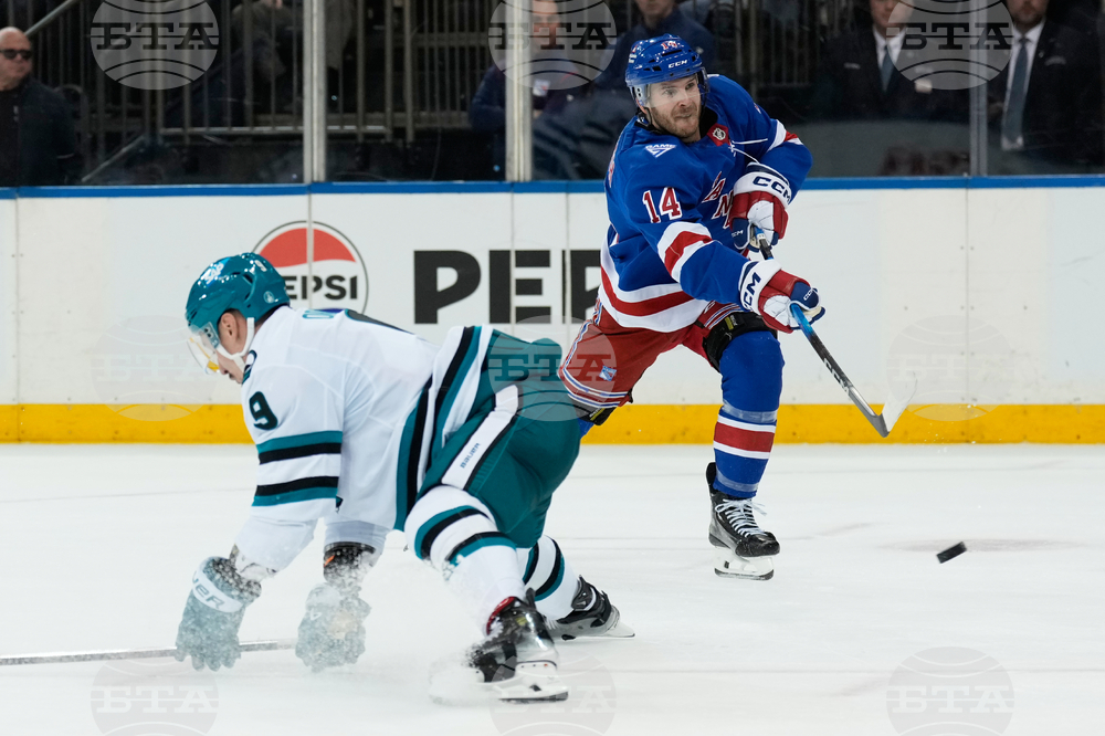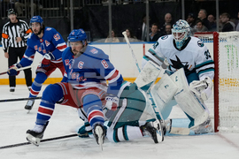 New York Rangers' J.T. Miller (8), second from left, goes down in front of San Jose Sharks goaltender Alex Nedeljkovic, right, during the second period of an NHL hockey game in New York, Thursday, Oct. 23, 2025. (AP Photo/Seth Wenig)