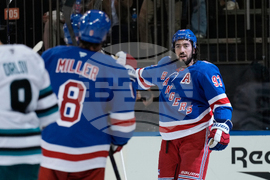 New York Rangers' Mika Zibanejad, right, celebrates his goal during the second period of an NHL hockey game against the San Jose Sharks in New York, Thursday, Oct. 23, 2025. (AP Photo/Seth Wenig)