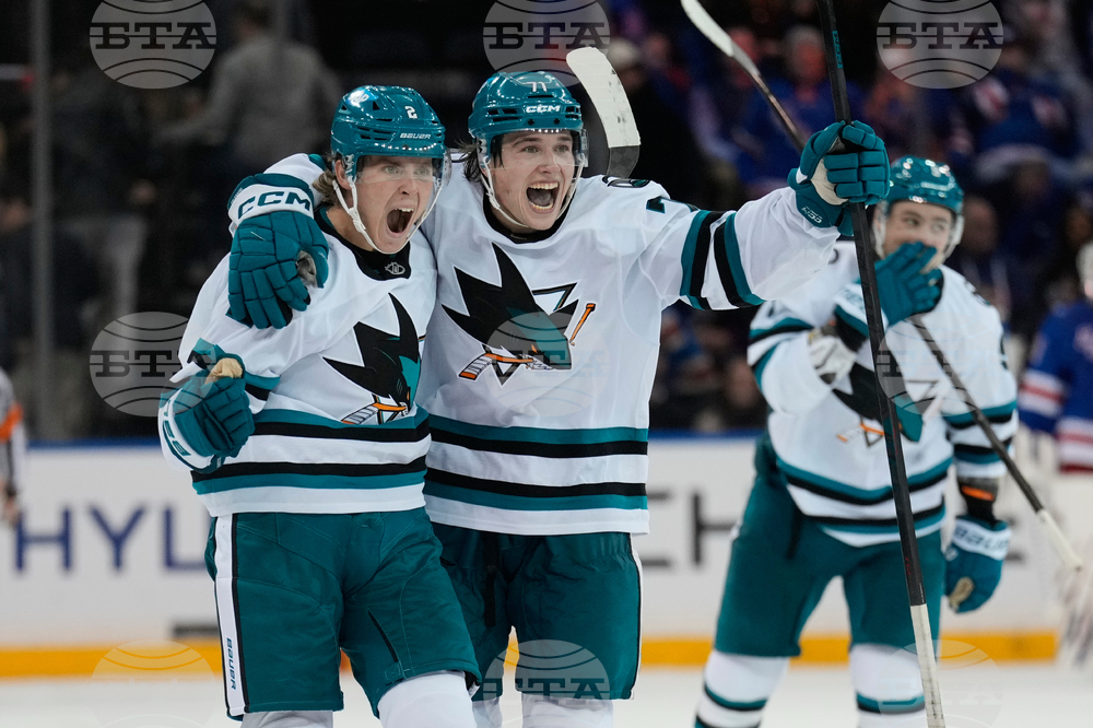 San Jose Sharks goaltender Alex Nedeljkovic makes a save during the overtime period of an NHL hockey game against the New York Rangers in New York, Thursday, Oct. 23, 2025. (AP Photo/Seth Wenig)