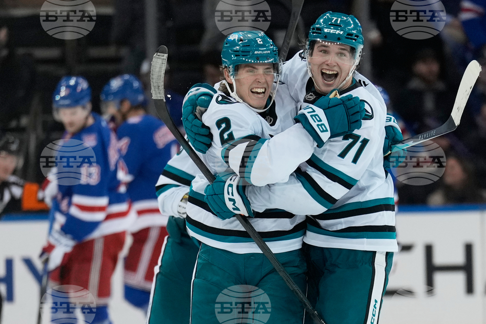 New York Rangers' Conor Sheary, left, and San Jose Sharks' Jeff Skinner battle for the puck during the first period of an NHL hockey game in New York, Thursday, Oct. 23, 2025. (AP Photo/Seth Wenig)