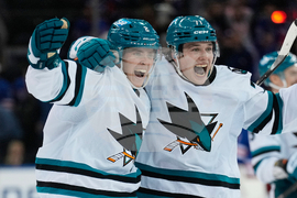 San Jose Sharks' Will Smith, left, celebrates his winning goal with Macklin Celebrini at the end of the overtime period of an NHL hockey game in New York, Thursday, Oct. 23, 2025. (AP Photo/Seth Wenig)