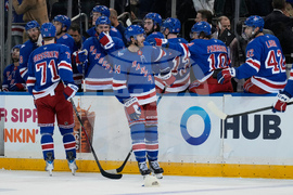 New York Rangers' Taylor Raddysh (14), center, celebrates his hat trick during the third period of an NHL hockey game against the San Jose Sharks in New York, Thursday, Oct. 23, 2025. (AP Photo/Seth Wenig)