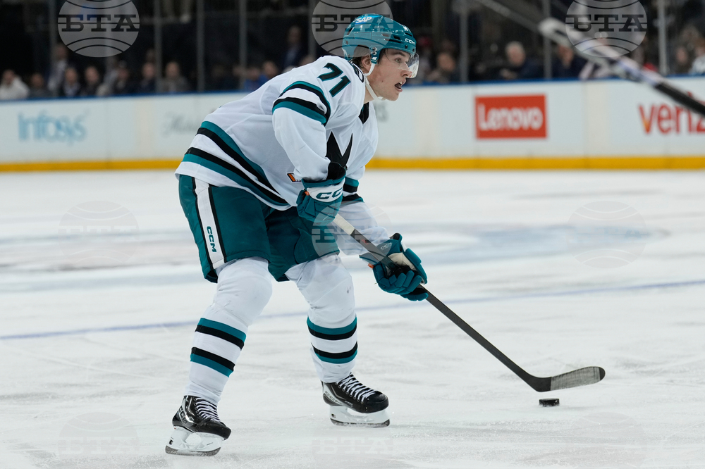 San Jose Sharks' Macklin Celebrini looks to shoot during the third period of an NHL hockey game against the New York Rangers in New York, Thursday, Oct. 23, 2025. (AP Photo/Seth Wenig)