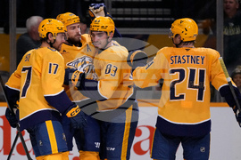 Nashville Predators center Ryan O'Reilly, second from left, celebrates his goal with center Tyson Jost (17), defensemen Adam Wilsby (83) and Spencer Stastney (24) during the second period of an NHL hockey game against the Vancouver Canucks, Thursday, Oct. 23, 2025, in Nashville, Tenn. (AP Photo/George Walker IV)