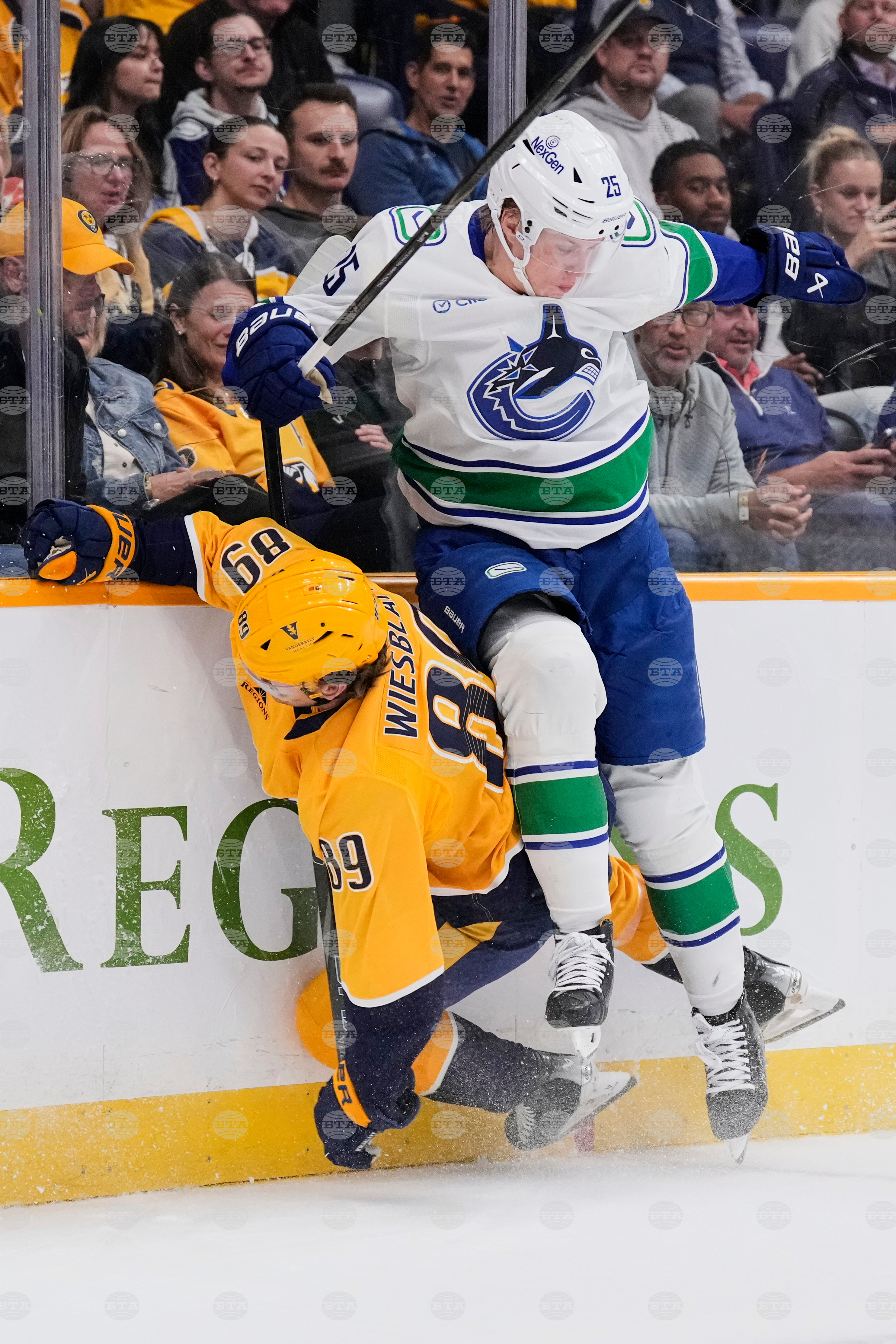 Nashville Predators right wing Ozzy Wiesblatt (89) and Vancouver Canucks defenseman Elias Pettersson (25) collide into the boards during the second period of an NHL hockey game Thursday, Oct. 23, 2025, in Nashville, Tenn. (AP Photo/George Walker IV)