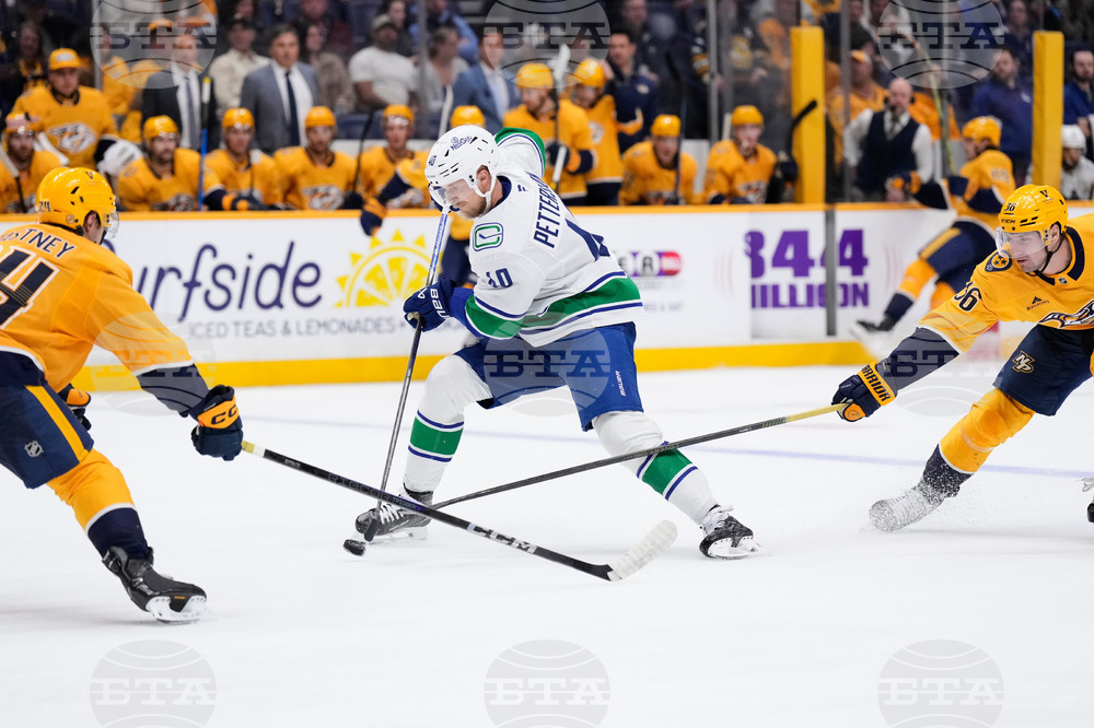 Vancouver Canucks center Elias Pettersson (40) passes the puck past Nashville Predators left wing Cole Smith (36) during the first period of an NHL hockey game Thursday, Oct. 23, 2025, in Nashville, Tenn. (AP Photo/George Walker IV)