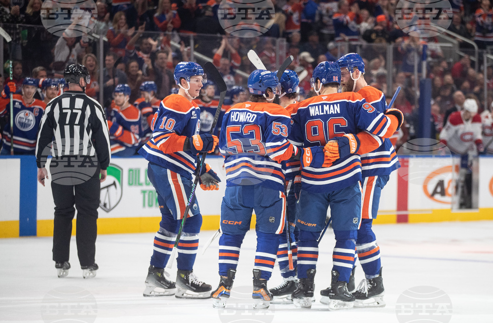 Edmonton Oilers players celebrate a goal against the Montreal Canadiens during third period NHL action, in Edmonton on Thursday, Oct. 23, 2025. (Jason Franson/The Canadian Press via AP)