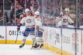 Montreal Canadiens' Alex Newhook (right) celebrates is goal against the Edmonton Oilers with teammates during first period NHL action, in Edmonton on Thursday, Oct. 23, 2025. (Jason Franson/The Canadian Press via AP)