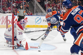 Montreal Canadiens' Cole Caufield (13) is stopped by Edmonton Oilers goalie Calvin Pickard (30) during first period NHL action, in Edmonton on Thursday, Oct. 23, 2025. (Jason Franson/The Canadian Press via AP)
