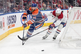 Montreal Canadiens' Jake Evans (left) and Edmonton Oilers' Brett Kulak (27) battle for the puck during third period NHL action, in Edmonton on Thursday, Oct. 23, 2025. (Jason Franson/The Canadian Press via AP)