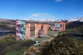 FILE - A woman stands next to a mural promoting presidential candidate Rodrigo Paz ahead of the presidential runoff election, on the outskirts of La Paz, Bolivia, Oct. 18, 2025. (AP Photo/Juan Karita, File)