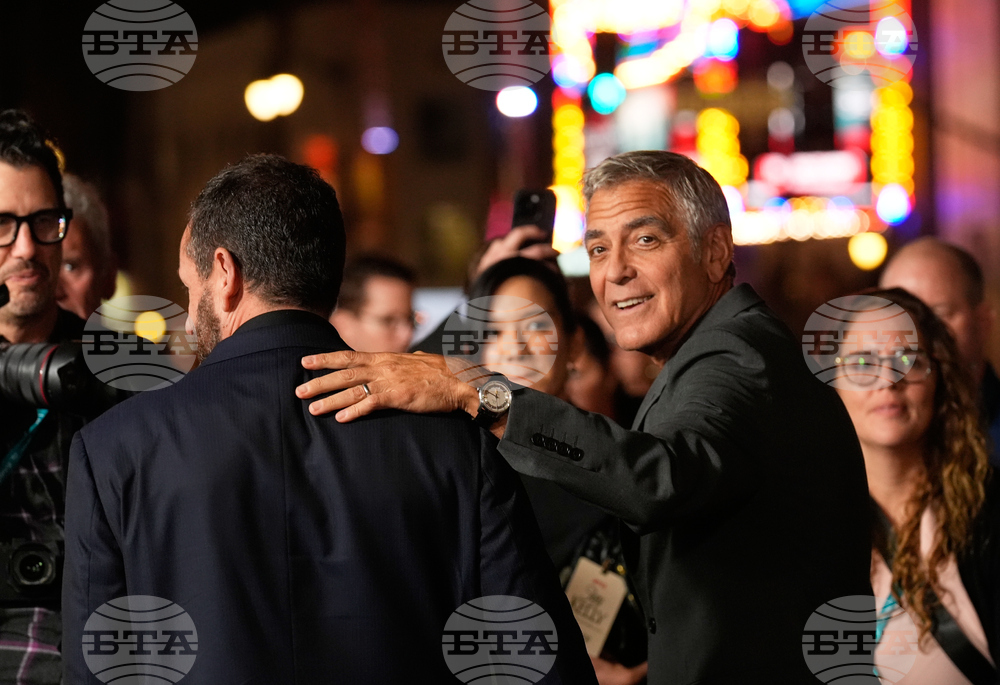 George Clooney, right, a cast member in "Jay Kelly," turns back for photographers as he arrives with fellow cast member Adam Sandler at the AFI Fest premiere of the film on Thursday, Oct. 23, 2025, at TCL Chinese Theatre in Los Angeles. (AP Photo/Chris Pizzello)