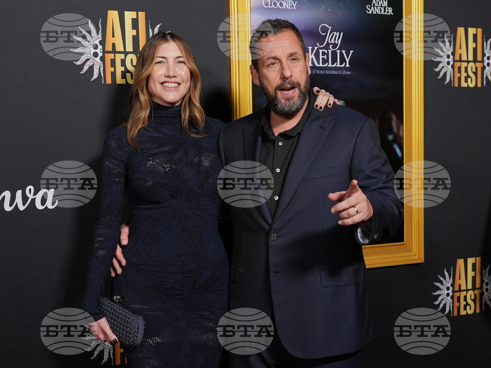 Adam Sandler, right, a cast member in "Jay Kelly," arrives with his wife Jackie Sandler at the AFI Fest premiere of the film on Thursday, Oct. 23, 2025, at TCL Chinese Theatre in Los Angeles. (AP Photo/Chris Pizzello)
