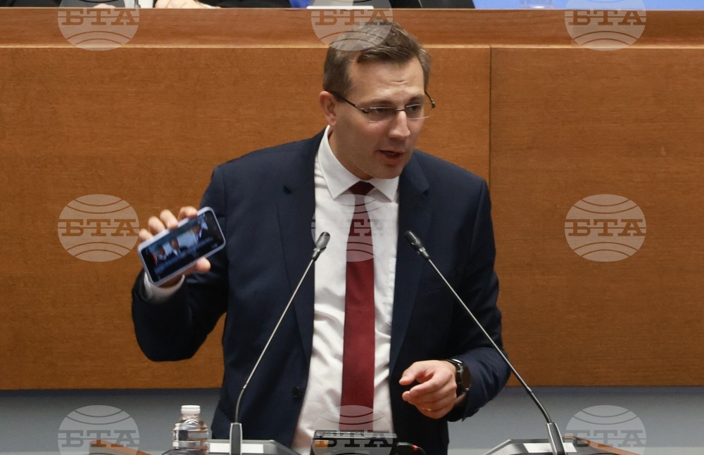 София (24 октомври 2025) Парламентът провежда редовно заседание в сградата Народното събрание. На снимката: лидерът на партия „Морал, единство, чест” (МЕЧ) Радостин Василев (вдясно).