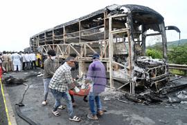 Volunteers remove a dead body from the debris of a passenger bus which caught fire early Friday after a collision with a motorbike on a highway, in Chinnatekuru village, near Kurnool district in Andhra Pradesh state, India, Friday, Oct. 24, 2025. (AP Photo)