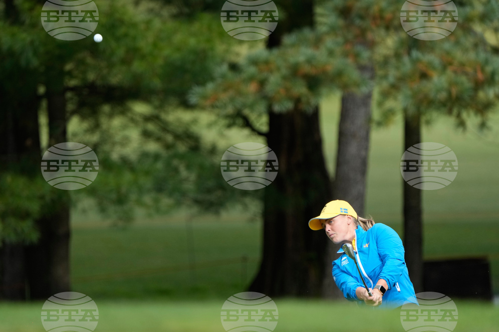 Madelene Sagstrom of Sweden watches her shot on the third hole during the pool B match against Japan for day two of the LPGA International Crown golf tournament at the New Korea Country Club in Goyang, South Korea, Friday, Oct. 24, 2025. (AP Photo/Ahn Young-joon)
