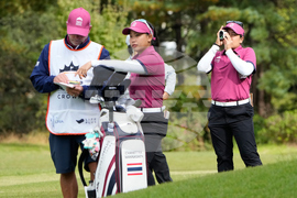 Steph Kyriacou, right, of Australia reacts with her teammate Minjee Lee on the second hole during the pool A match against China for day two of the LPGA International Crown golf tournament at the New Korea Country Club in Goyang, South Korea, Friday, Oct. 24, 2025. (AP Photo/Ahn Young-joon)