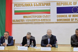 Плевен (24 октомври 2025) В Плевен се провежда десетото заседание на Областния кризисен щаб за справяне с безводието. На снимката (от ляво надясно): кметът на община Плевен Валентин Христов, областният управител Мартин Мачев и председателите на Общинските съвети в Плевен и Долна Митрополия Иван Малкодански и Петър Петров.