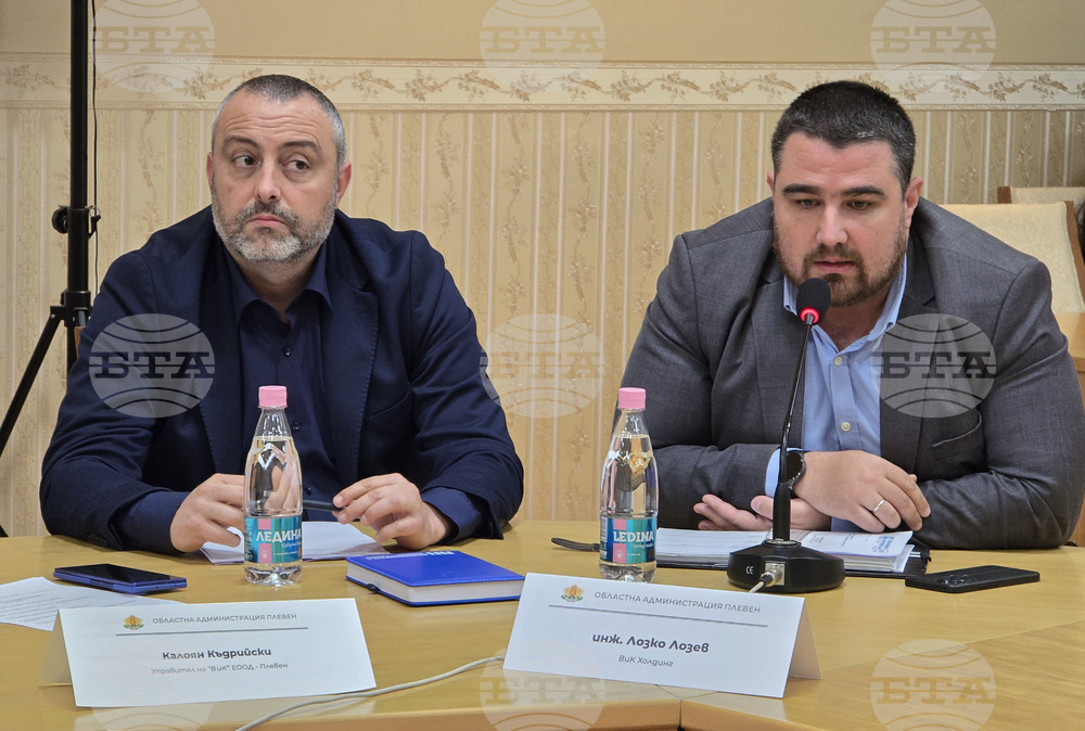 Плевен (24 октомври 2025) В Плевен се провежда десетото заседание на Областния кризисен щаб за справяне с безводието. На снимката: управителят на „Водоснабдяване и канализация“ ЕООД – Плевен Калоян Къдрийски (вляво) и председателят на Управителния съвет на „Български ВиК холдинг“ инж. Лозко Лозев.