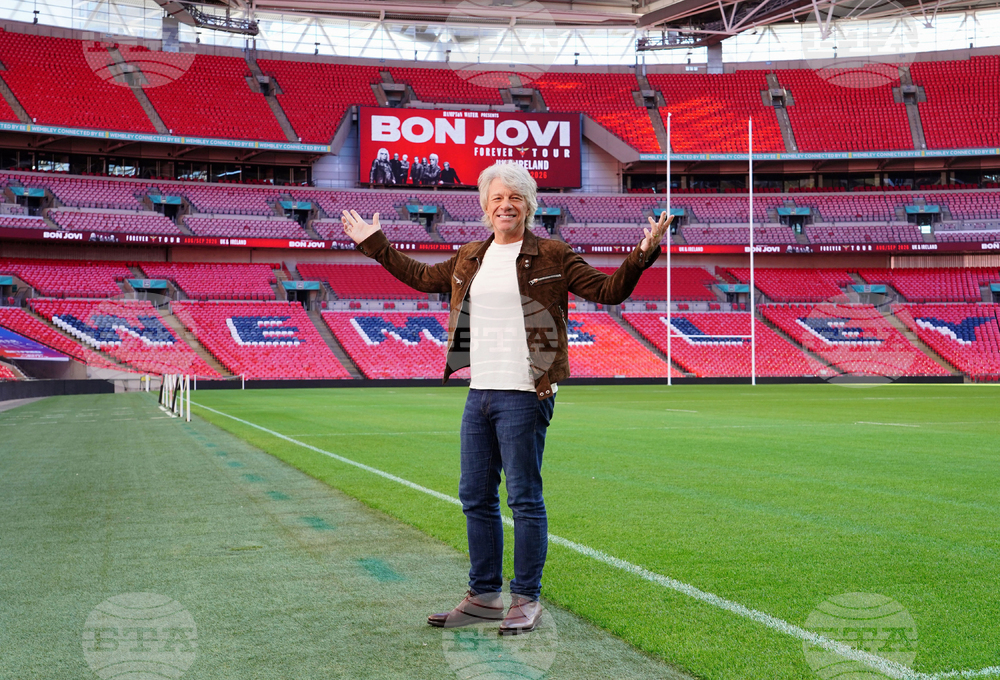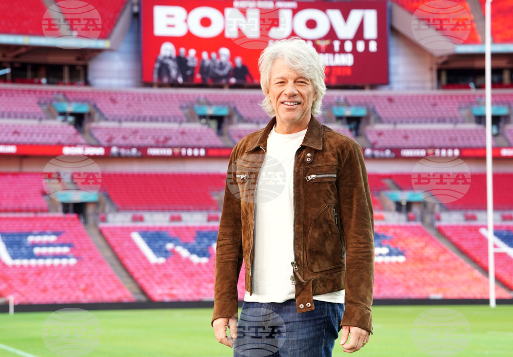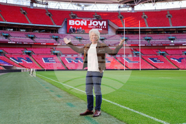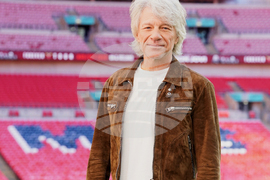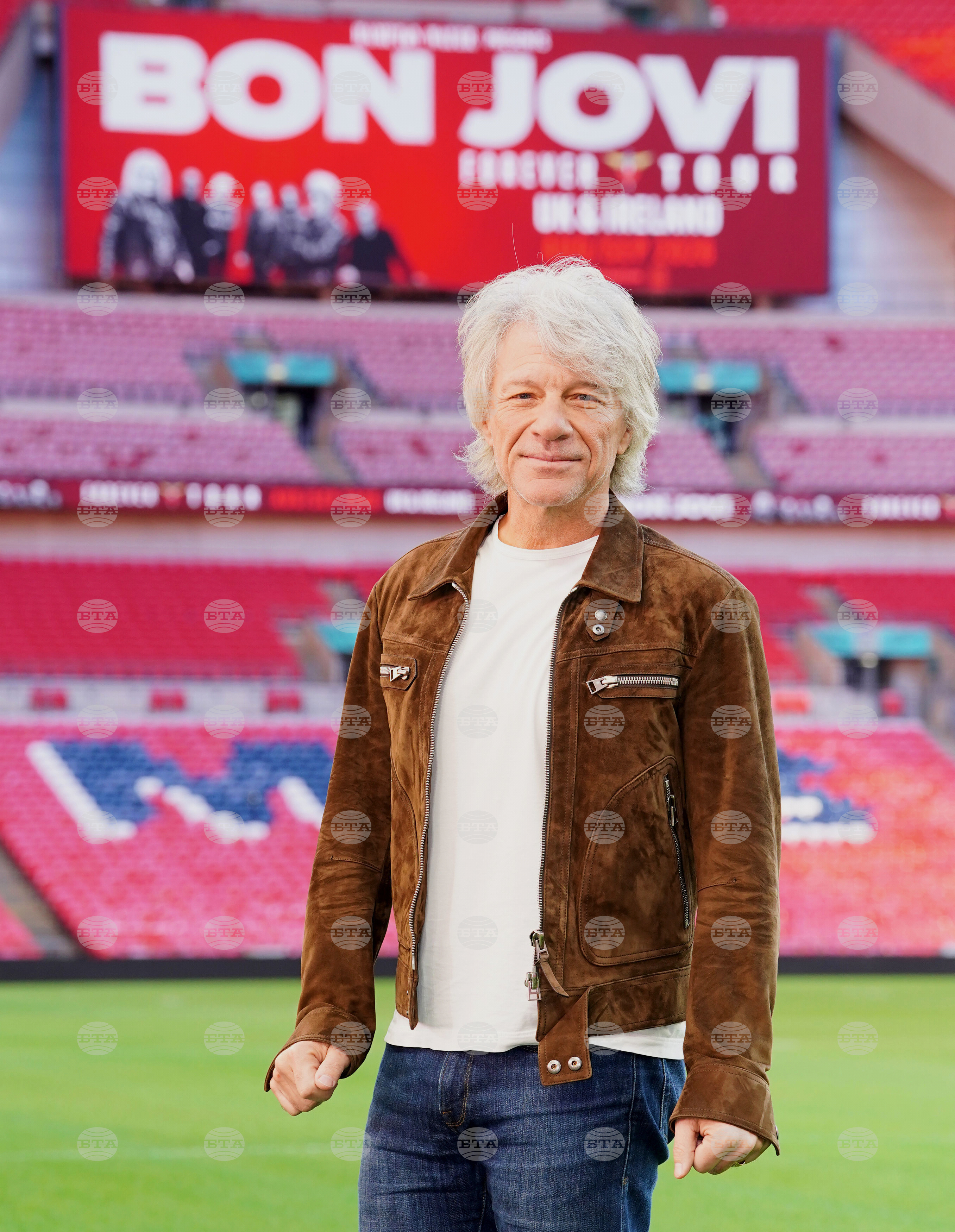 Singer Jon Bon Jovi poses for a photo at a press conference at Wembley Stadium to make an announcement and promote his new collaborations album, Forever, in north London, Friday, Oct. 24, 2025. (Ian West/PA via AP)