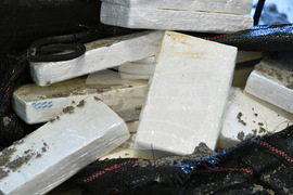 Seized cocaine from a drop-off off Borkum is presented during a press conference at the Federal Criminal Police Office (BKA), in Wiesbaden, Germany, Friday Oct. 24, 2025, as the Federal Ministry of the Interior and the BKA present the Federal Situation Reports on Narcotics and Organized Crime 2024. (Arne Dedert/dpa via AP)