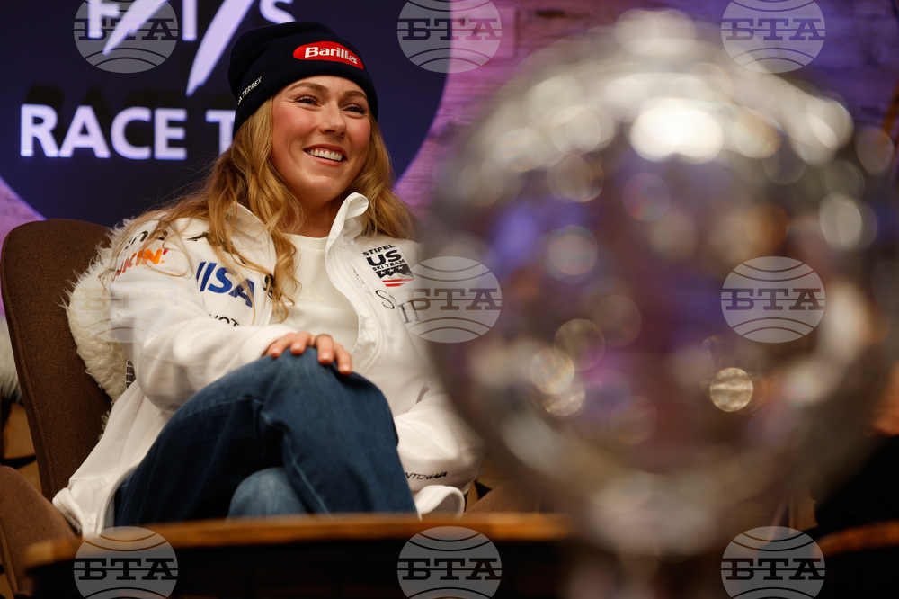 United States' Mikaela Shiffrin speaks ahead of the alpine ski, World Cup opening races, in Soelden, Austria, Friday, Oct. 24, 2025. (AP Photo/Alessandro Trovati)