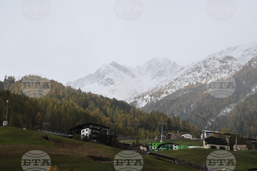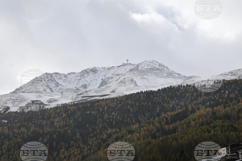 Snow partially blankets the mountain landscape, ahead of Saturday's alpine ski, World Cup opening races, in Soelden, Austria, Friday, Oct. 24, 2025. (AP Photo/Marco Trovati)