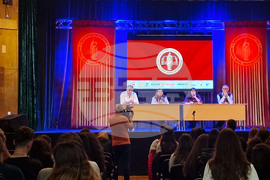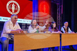 Хасково (24 октомври 2025) В Хасково започва петото издание на Националния поетичен конкурс „Майко моя, моя Богородице“. В рамките на поетичния форум в Младежкия център се провежда дискусия на тема „Поезията в дигиталния свят“. Модератори на дебата са (от ляво надясно) организаторът на конкурса от „Алфа криейтив тийм“ Митко Ламбов, поетесата и преводачка Аксиния Михайлов, писателите Виолета Христова-Гъркова и Румен Баросов.
