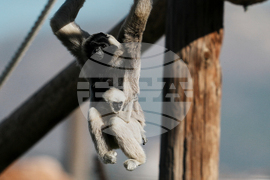 E.T., a four-month-old pileated gibbon and one of four recently born animals, hugs its mother, Nyami, as she climbs on ropes at the Attica Zoological Park near Athens, Greece, Friday, Oct. 24, 2025. (AP Photo/Thanassis Stavrakis)