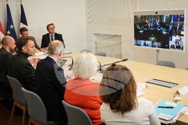 French President Emmanuel Macron, second left, Luxembourg's Prime Minister Luc Frieden, third left, and French Foreign Minister Jean-Noel Barrot, left, attend a video conference with British Prime Minister Keir Stamer and Ukrainian President Volodymyr Zelenskyy, Friday, Oct. 24, 2025 at the Elysee Palace in Paris. (AP Photo/Thomas Padilla, Pool)
