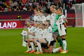 German players pose before the UEFA Women¥s Nations League semifinal first leg soccer match between Germany and France in Duesseldorf, Germany, Friday, Oct. 24, 2025. (AP Photo/Martin Meissner)