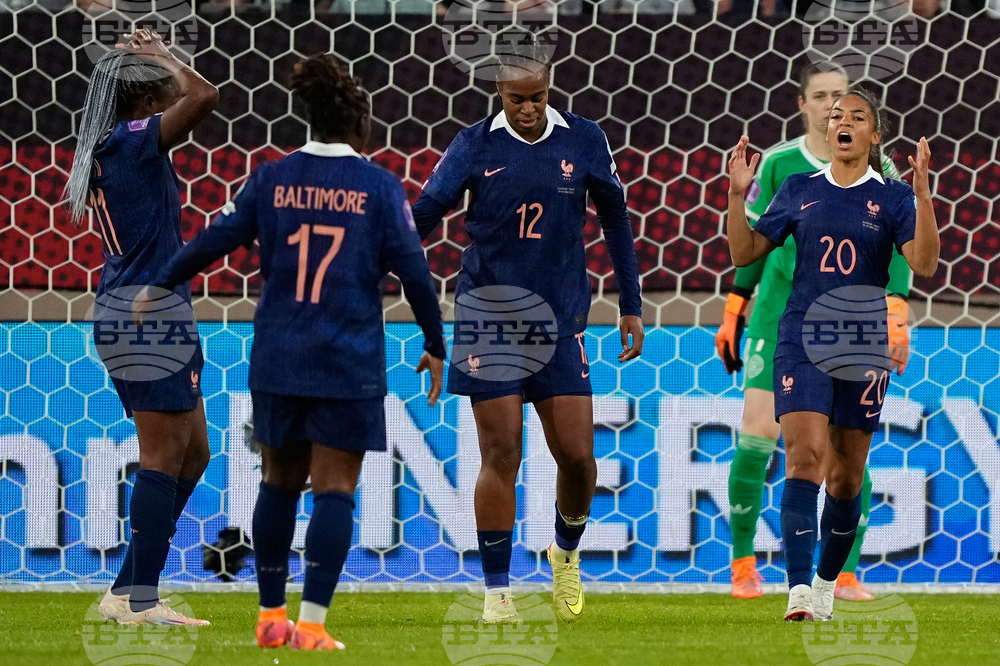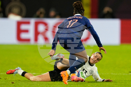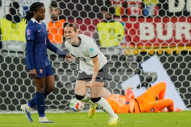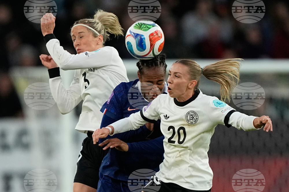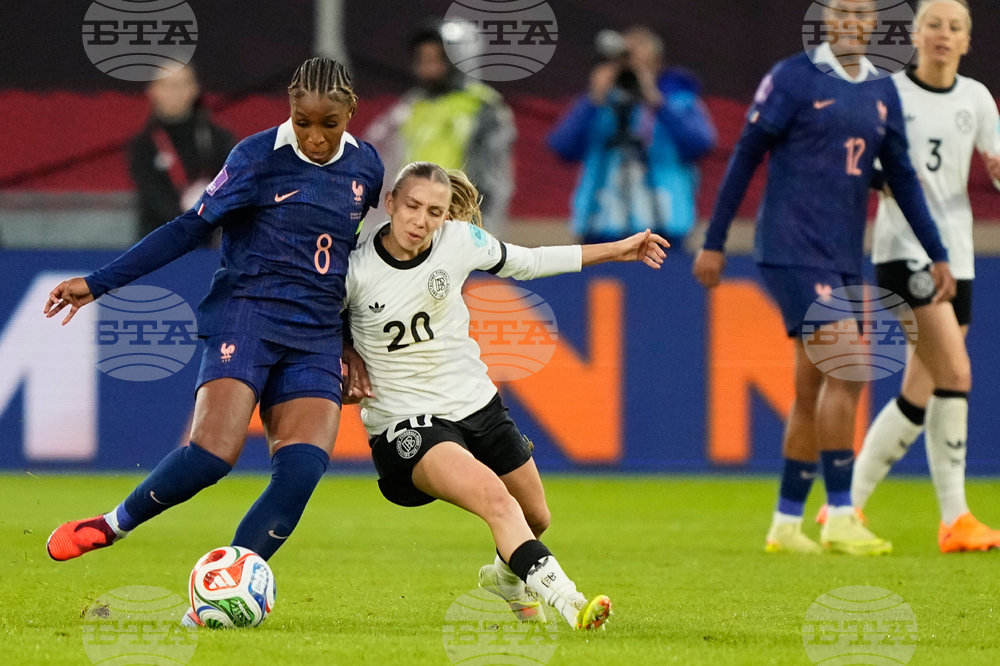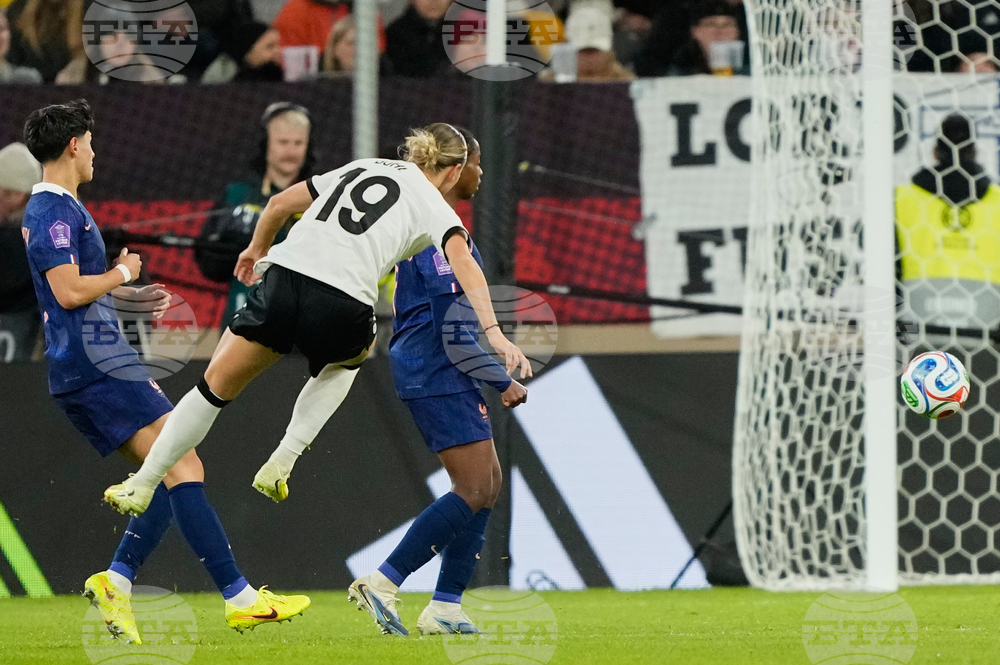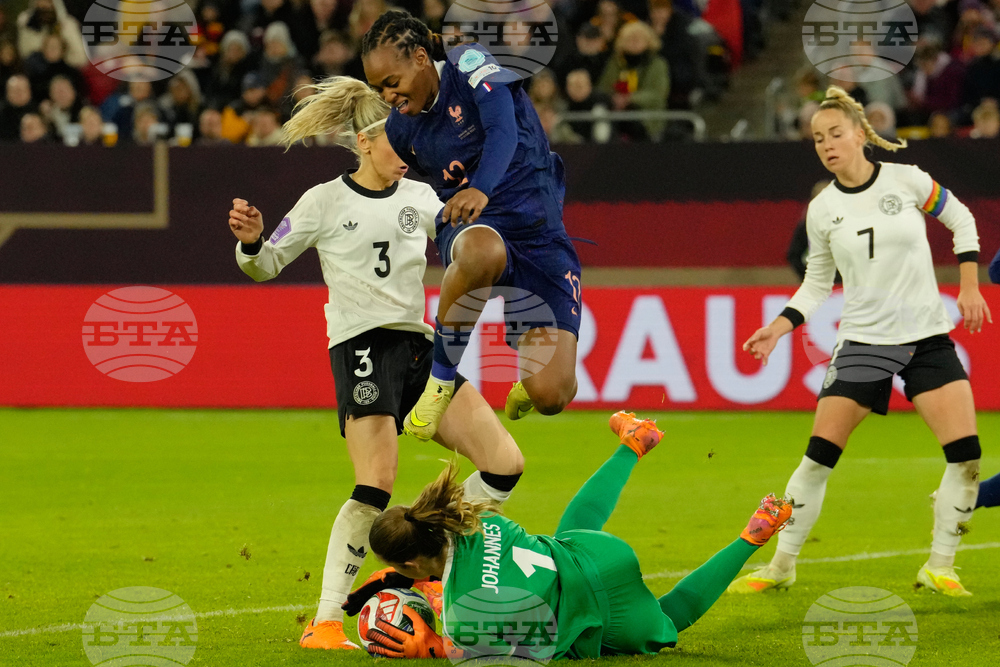 during the UEFA Women's Nations League semifinal first leg soccer match between Germany and France in Duesseldorf, Germany, Friday, Oct. 24, 2025. (AP Photo/Martin Meissner)