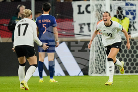 Germany's Klara Buehl cscores during the UEFA Women¥s Nations League semifinal first leg soccer match between Germany and France in Duesseldorf, Germany, Friday, Oct. 24, 2025. (AP Photo/Martin Meissner)