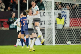 German players celebrate after a goal during the UEFA Women¥s Nations League semifinal first leg soccer match between Germany and France in Duesseldorf, Germany, Friday, Oct. 24, 2025. (AP Photo/Martin Meissner)