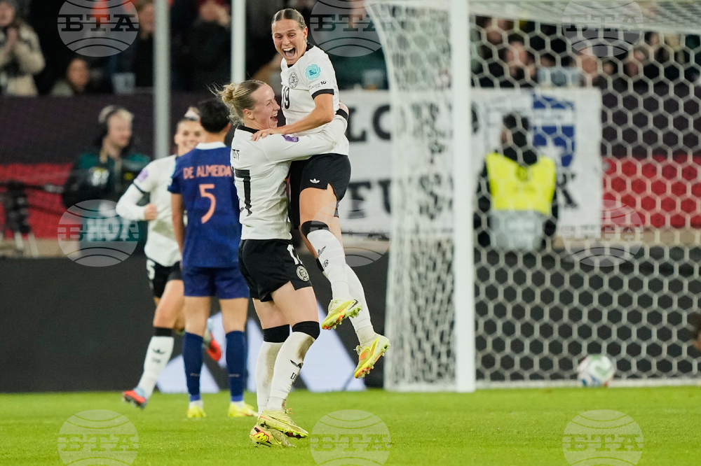 Germany's Franziska Kett, left, and Klara Buehl celebrate a goal during the UEFA Women¥s Nations League semifinal first leg soccer match between Germany and France in Duesseldorf, Germany, Friday, Oct. 24, 2025. (AP Photo/Martin Meissner)