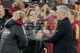 Germany's head coach Christian Wueck congratulates team members after the UEFA Women¥s Nations League semifinal first leg soccer match between Germany and France in Duesseldorf, Germany, Friday, Oct. 24, 2025. (AP Photo/Martin Meissner)
