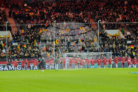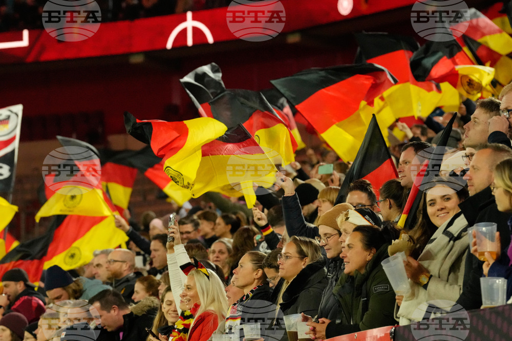 German fans celebrate after the UEFA Women's Nations League semifinal first leg soccer match between Germany and France in Duesseldorf, Germany, Friday, Oct. 24, 2025. (AP Photo/Martin Meissner)