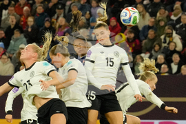 German players jump for the ball during the UEFA Women's Nations League semifinal first leg soccer match between Germany and France in Duesseldorf, Germany, Friday, Oct. 24, 2025. (AP Photo/Martin Meissner)