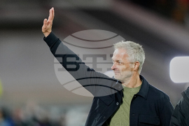 Germany's head coach Christian Wueck waves after the UEFA Women's Nations League semifinal first leg soccer match between Germany and France in Duesseldorf, Germany, Friday, Oct. 24, 2025. (AP Photo/Martin Meissner)